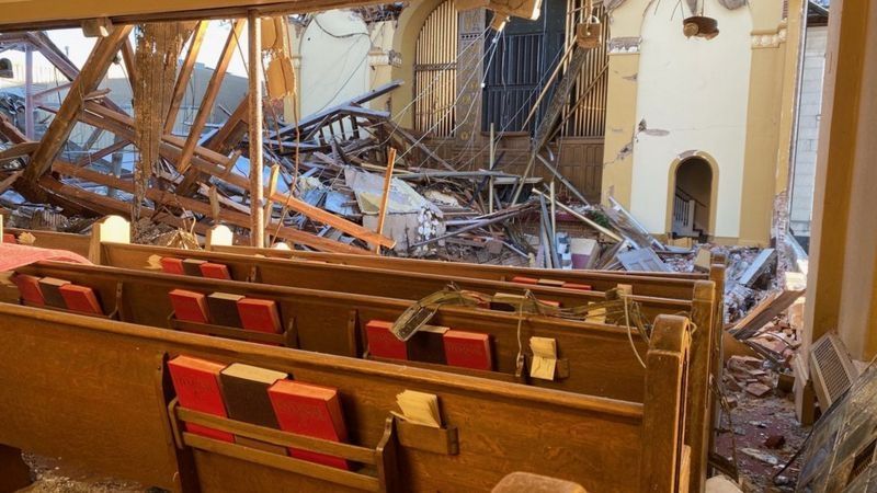 La vidriera estalló y los escombros cubren los bancos. Mucha gente se refugió allí cuando pasó el tornado.
