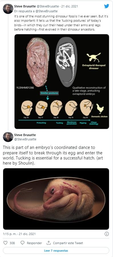 El paleontólogo Steve Brusatte, quien también formó parte del equipo de investigación, tuiteó que era "uno de los fósiles de dinosaurio más impresionantes" que había visto en su vida y que el embrión estaba a punto de eclosionar.
