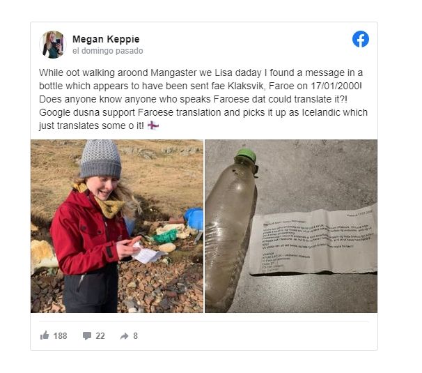 Una joven mujer que paseaba por una de las playas de Escocia, específicamente por las islas Shetland, vio una botella y se acercó para recogerla y tirarla a la basura. Sin embargo, al momento de alzarla se dio cuenta que adentro había un papel. Una vez que la abrió pudo darse cuenta de que el papel se encontraba en excelente estado y que, además, contenía un mensaje escrito en computadora.