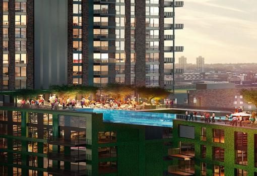 La pileta al aire libre, a 35 metros de altura, une dos edificios residenciales de diez pisos. Quienes naden en ella podrán pasar de un edificio a otro.