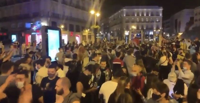 Desde las 0 horas del domingo miles de personas se reunieron en la Puerta del Sol, Lavapiés y Malasaña para celebrar el final del estado de alarma y emborracharse. Las imágenes que se viralizaron en redes sociales generaron una gran preocupación porque muchas de las personas presentes no tenían barbijo y se teme que puedan dispararse los contagios en unos días.