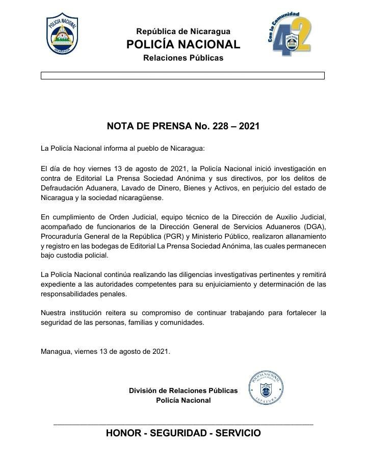 "El grito de alarma de La Prensa ocurre en medio de que la dictadura de Daniel Ortega y Rosario Murillo ha aumentado las presiones, amenazas y hostigamientos contra los periodistas independientes en Nicaragua. Desde finales de mayo, casi a diario decenas de comunicadores han sido citados en el Ministerio Público por el caso de supuesto lavado de dinero en contra de la Fundación Violeta Barrios de Chamorro, y la mayoría de ellos ha sido amenazado con la Ley 1042 o Ley de Ciberdelitos, en entrevistas en las que los fiscales actúan de forma hostil e inquisidora", advirtieron periodistas y defensores de derechos humanos.