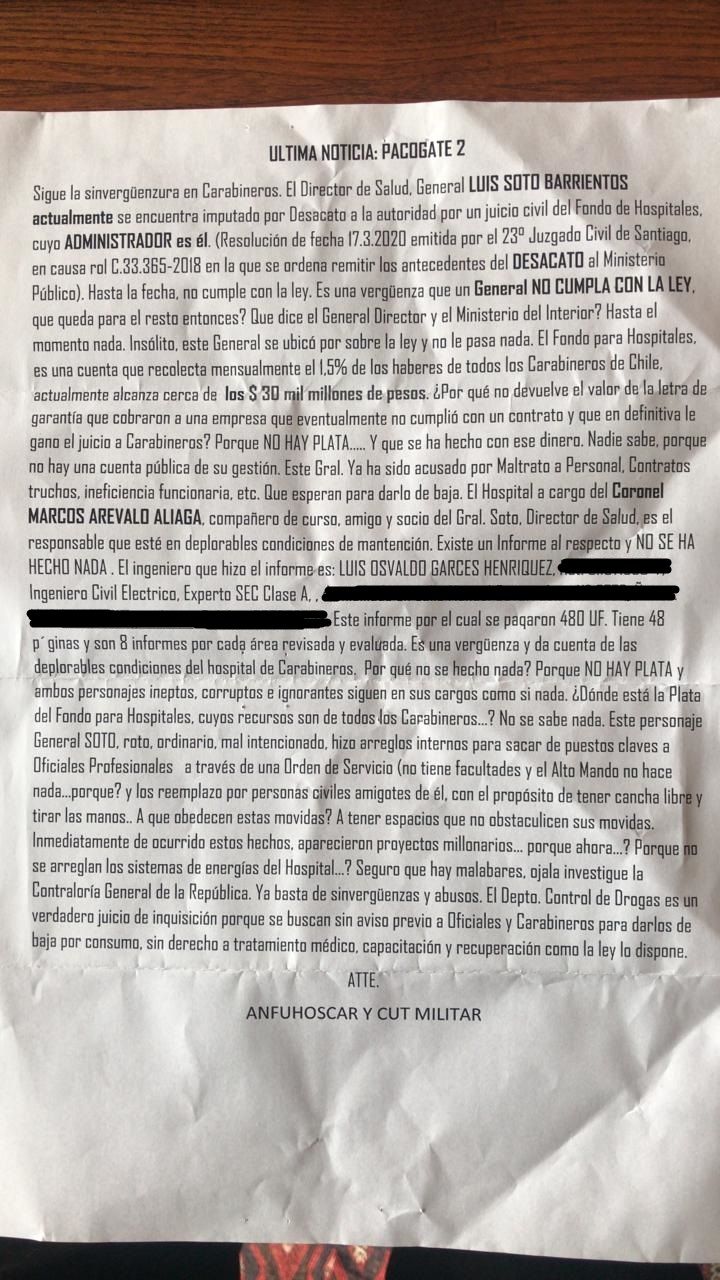 Otro de los hechos por los que esta institución es investigada fue la desaparición de un monto de dinero que alcanzaría los 30 mil millones de pesos chilenos. Se trata de un Fondo para Hospitales que aglomera en una cuenta la recolecta mensual del 1,5% de los haberes de todos los carabineros. El hecho fue denunciado mediante un panfleto que también denuncia maltratos, contratos truchos e ineficiencia funcionaria.