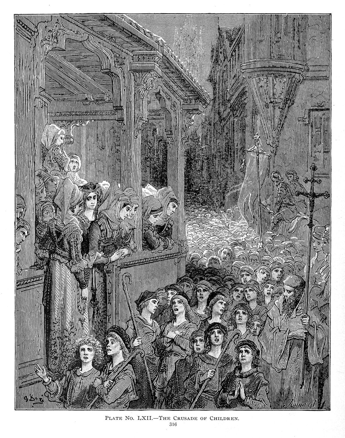 Al mismo tiempo, un niño alemán aseguraba que le había ocurrido lo mismo, juntó a otros infantes y se unió con el profeta francés. En total unos 30 mil comienzan su peregrinación a Niza. En el camino varios mueren de hambre o desertan. Finalmente llegaron unos 2 mil a la ciudad costera.