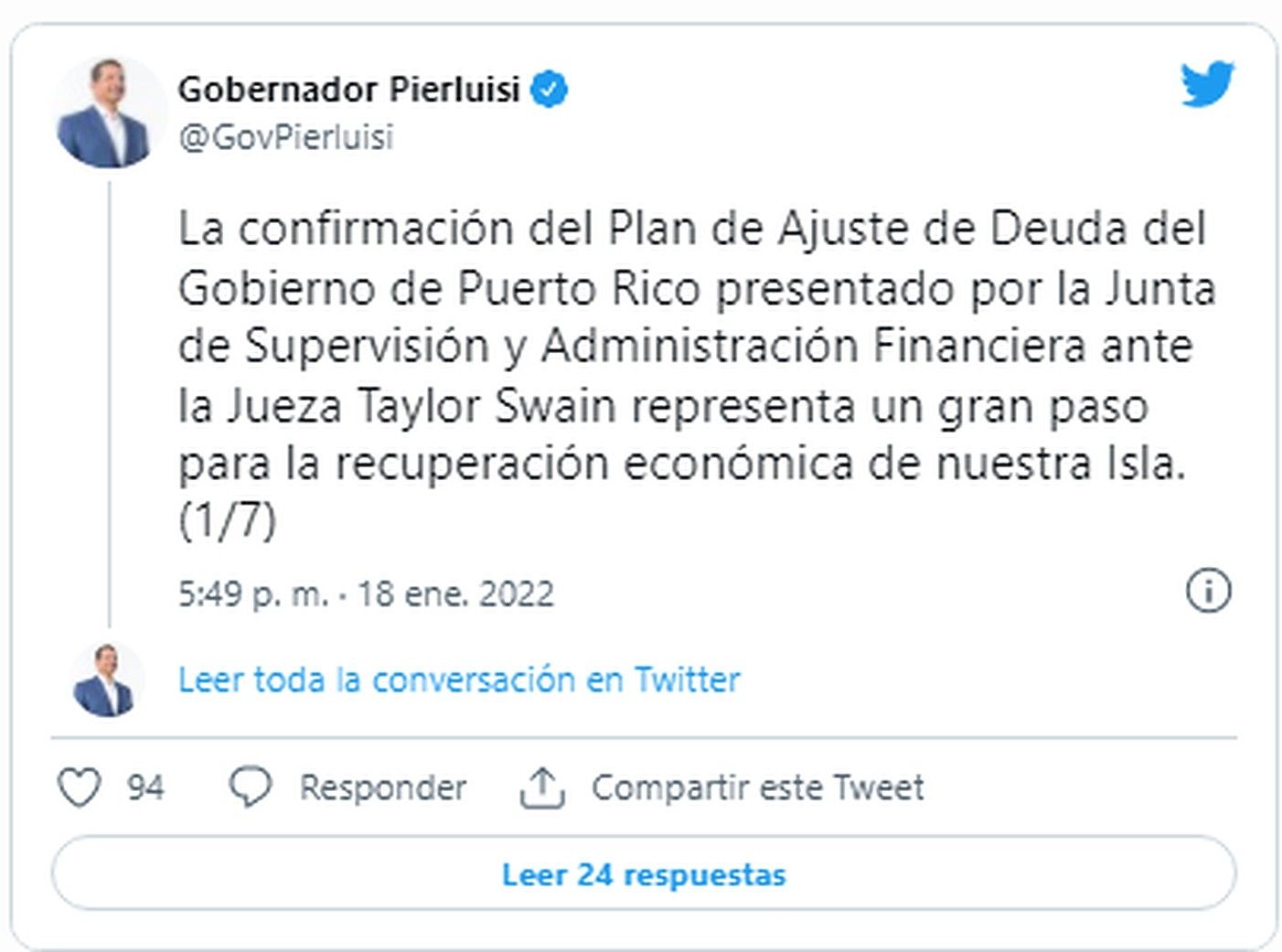 Por su parte, el gobernador de Puerto Rico, Pedro Pierluisi, aplaudió la decisión de la juez Swain a través de un hilo de siete tuits, en los que habló de un "momento trascendental" para la isla y dijo que, aunque el acuerdo "no es perfecto, es muy bueno para Puerto Rico".