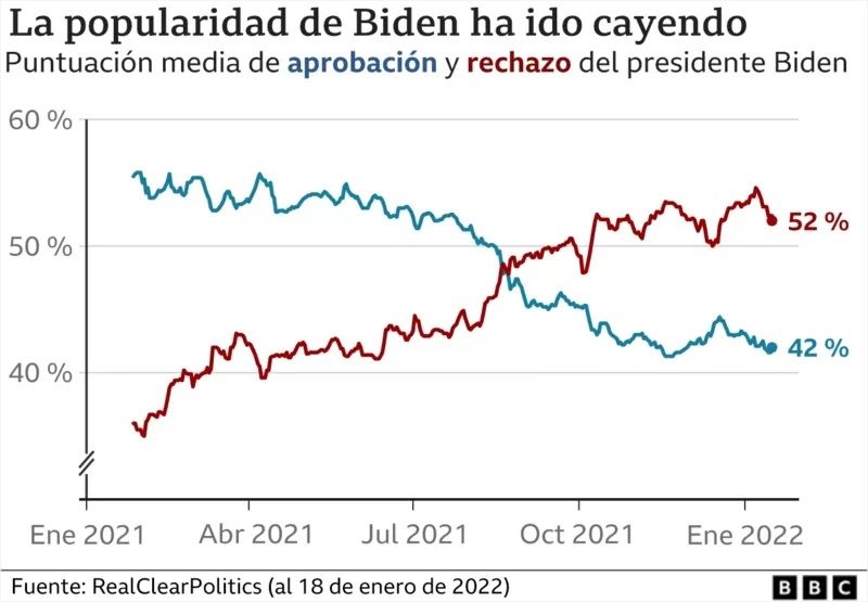 Esto se ha reflejado en las encuestas, en las que luego de culminar sus primeros 100 días de gobierno con un apoyo de 57%, Biden ha visto menguar esos números. En septiembre pasado, cayeron tras la polémica retirada de las fuerzas estadounidenses en Afganistán y desde entonces han permanecido en torno a 43%, de acuerdo con Gallup.