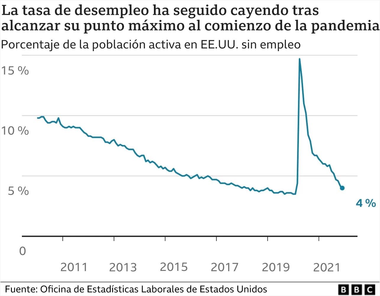 Entre enero y diciembre de 2021 la tasa de desempleo en Estados Unidos se redujo de 6,4% a 3,9%, según datos de la Oficina de Estadísticas Laborales. Se trata, según los economistas, de la mayor caída del desempleo en un mismo año ocurrida en la historia del país.