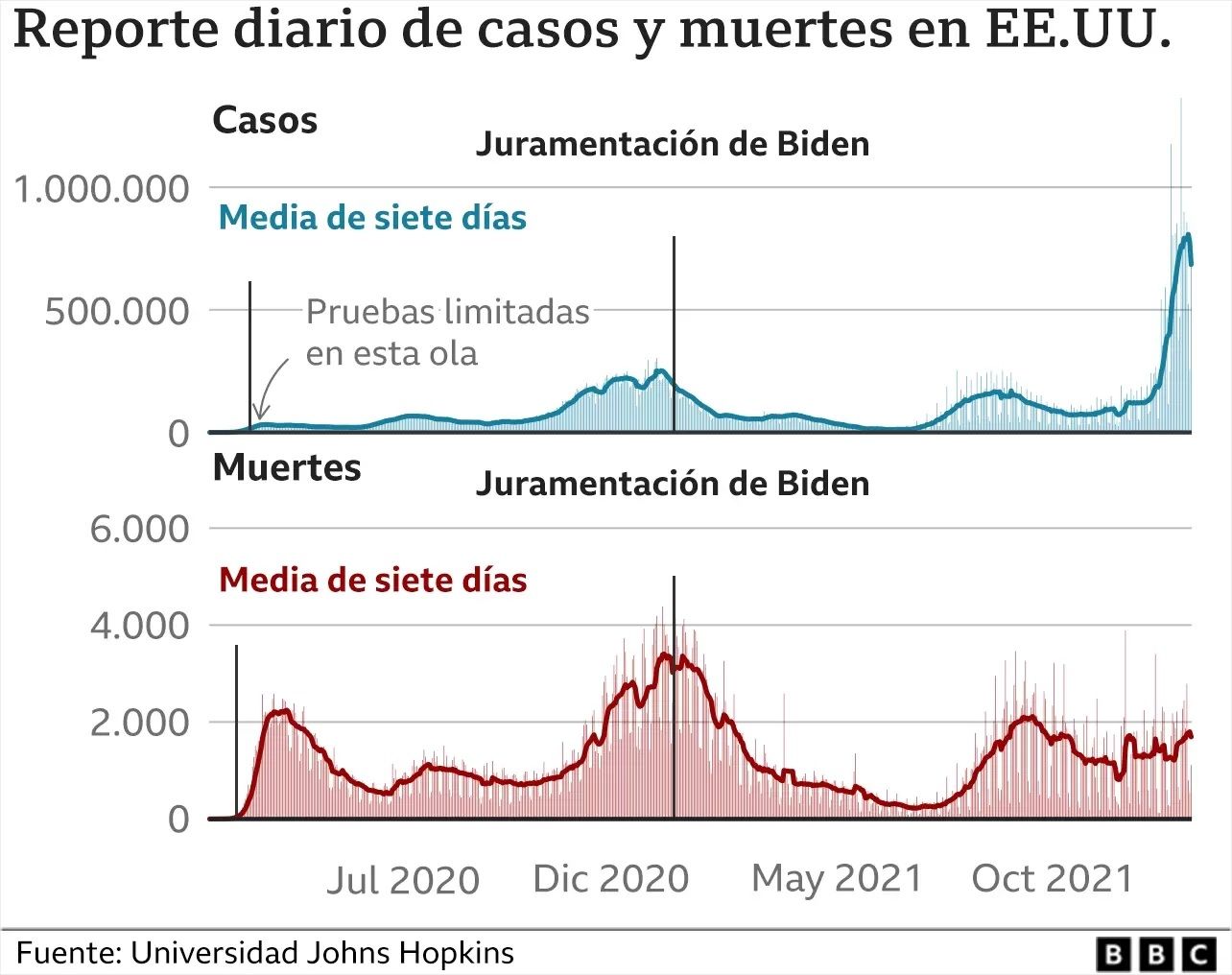 El 4 de julio llegó y, aunque la meta de Biden no se alcanzó, millones de estadounidenses se quitaron las mascarillas, se abrazaron y viajaron. Y del promedio de 10.000 nuevos casos diarios que se registraban entonces, debido al arribo de la variante delta, las infecciones se elevaron hasta unas 125.000 diarias. Este récord se quedaría pequeño con el impacto posterior de ómicron, cuando la cifra de casos diarios confirmados ha superado los 800.000.