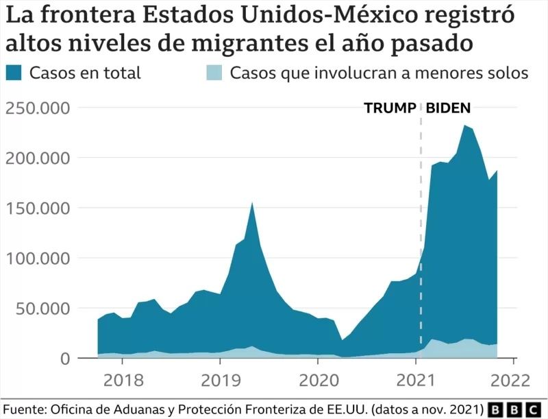 Por si fuera poco, durante el primer año de Biden el número de migrantes y solicitantes de asilo que llegaron hasta las fronteras de Estados Unidos creció de forma exponencial en relación con los años anteriores y, en ocasiones, causó una imagen caótica, como cuando en septiembre de 2021 decenas de miles de migrantes mayormente haitianos establecieron un campamento bajo un puente que une Del Río, en Estados Unidos, con Ciudad Acuña, en México.
