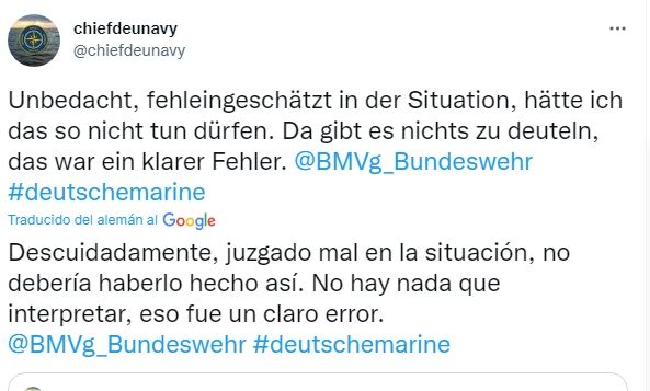 Ante las declaraciones y el conflicto diplomático, el Ministerio de Defensa alemán se distanció de Schoenbach: “El contenido y las palabras elegidas no se corresponden en absoluto con la postura del Ministerio de Defensa”, informó un vocero. Luego el jefe de la Marina publicó en twitter un comunicado donde asegura que sus declaraciones fueron un error, pero que fueron sacadas de contexto.