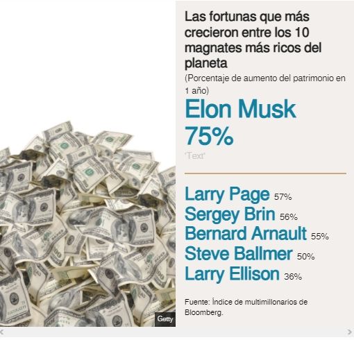 Le siguen a Musk otros superricos como los cofundadores de Google Larry Page y Sergey Brin (con un alza de sus fortunas el año pasado de 57% y 56%, respectivamente).