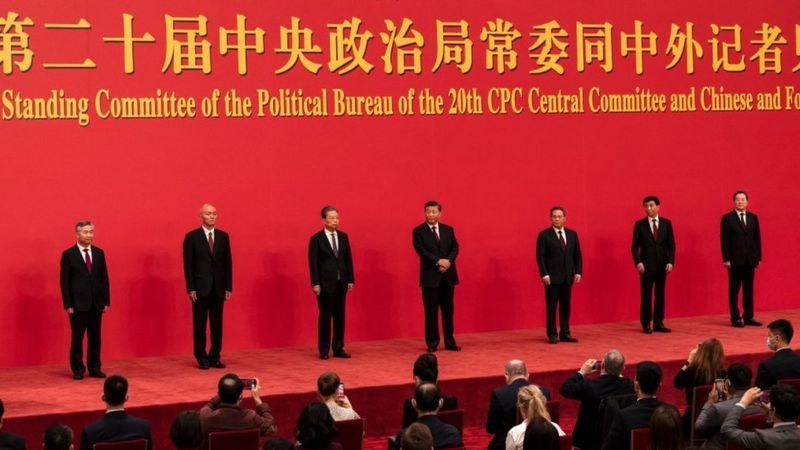 Los miembros del Comité Permanente (de izquierda a derecha): Li Xi, Can Qi, Zhao Leji, Xi Jinping , Li Qiang, Wang Huning y Ding Xuexing.