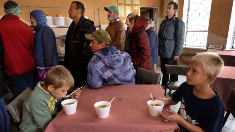 Nikita, de 7 años y su hermano Yegor, de 8, almuerzan un comedor de beneficencia recién abierto en Izium, una ciudad que fue liberada recientemente por Ucrania. Muchas tiendas y comercios locales fueron destruidos.