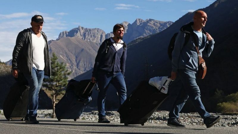 En la línea fronteriza que separa Rusia y Georgia, las personas, en su mayoría jóvenes rusos, pueden pasar días en los atascos mientras intentar abandonar su país