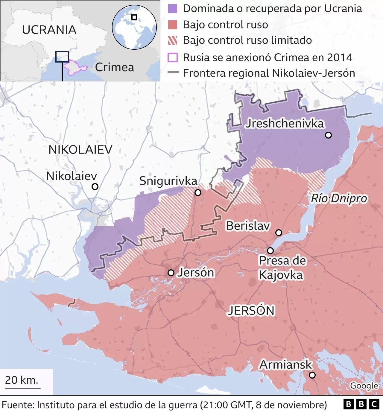 Jersón, que antes de la guerra contaba con una población de 380.000 personas, "es la puerta a Crimea", explica a la BBC Marina Miron, investigadora de estudios de defensa en el Kings College de Londres. "Recuperarla podría facilitar el camino para reconquistar Crimea, algo que Ucrania busca conseguir en esta guerra".