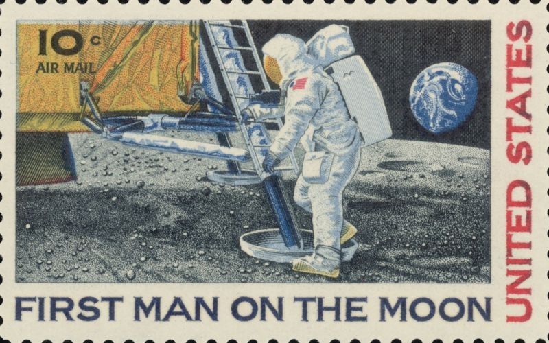 No es que fuera una obligación, pero lo cierto es que el servicio postal americano hizo la tirada más grande de sellos que se había hecho en la historia, más de 5 millones de sellos. Como no tenían fotos de astronautas pisando la luna, el artista Paul Calle pintó un astronauta bajando del módulo lunar y pisando la luna con el pie izquierdo.