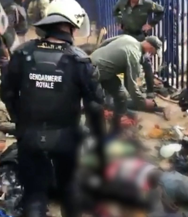 Un hombre es rodeado por la policía marroquí antes de que su cuerpo sin vida parezca ser arrastrado hacia el lado marroquí. Otro es pinchado por una porra de la policía marroquí y parece estar muerto.