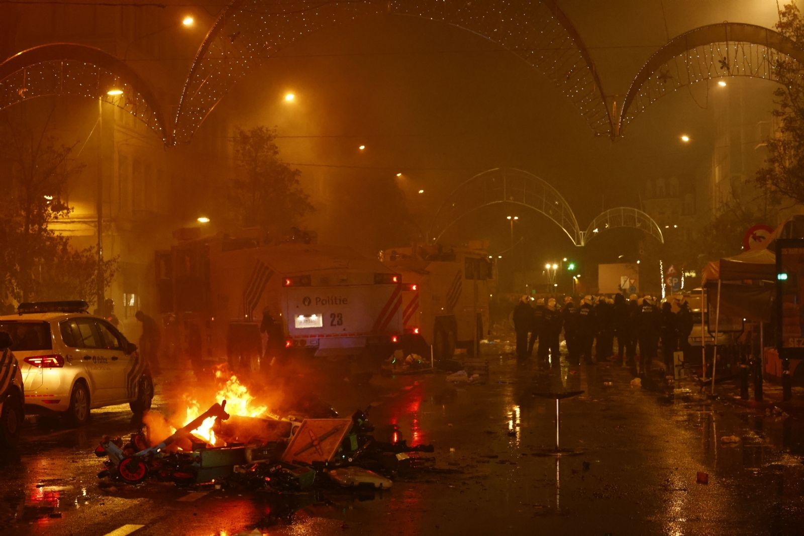Los incidentes comenzaron a mitad del segundo tiempo, cuando unos 150 jóvenes reunidos en el centro de la capital belga prendieron fuego a un contenedor y lanzaron petardos y fuegos artificiales, tras lo cual la emprendieron a golpes con los vehículos estacionados en la zona, según informa la televisión pública belga RTBF.