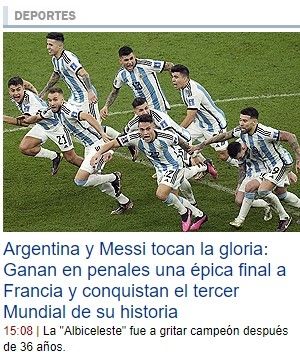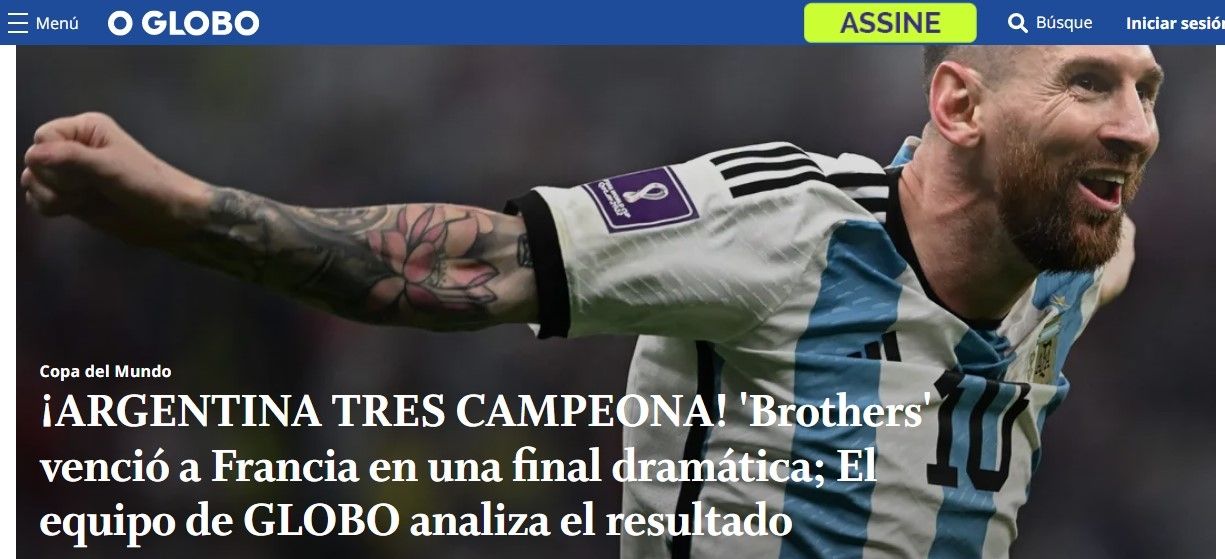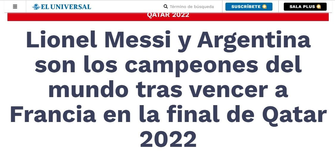 A este emotivo título sumó: "En una definición extraordinaria, la Albiceleste gana el Mundial por tercera vez en su historia, en los penales, luego de un infartante 3-3 en 120 minutos. La Pulga tiene la corona que tanto anhelaba, para ser el heredero de Diego definitivamente".