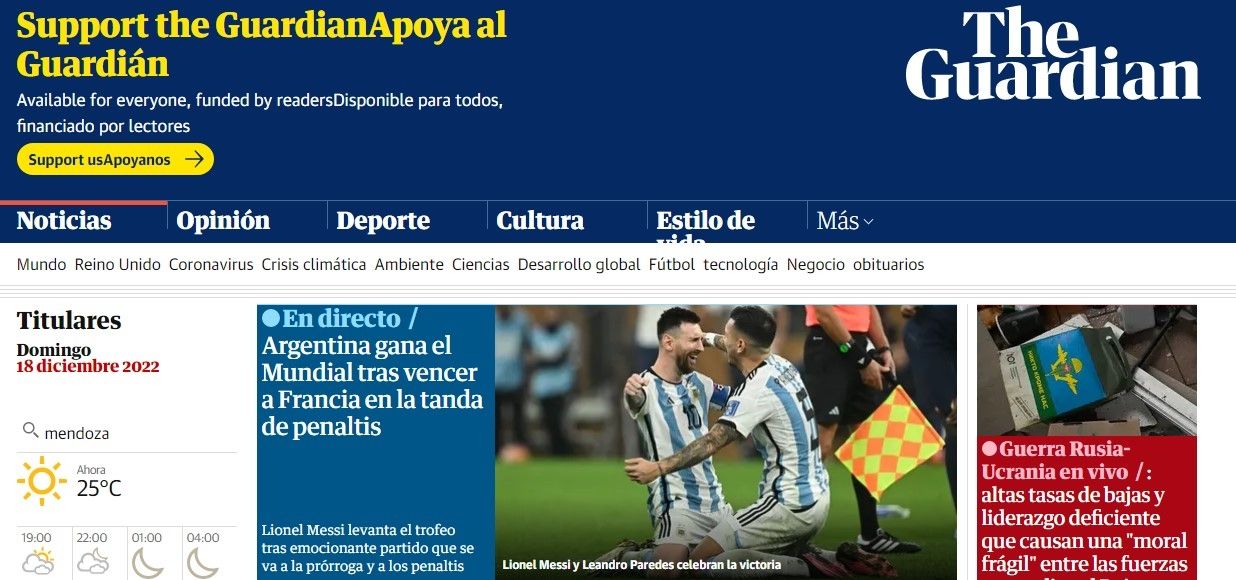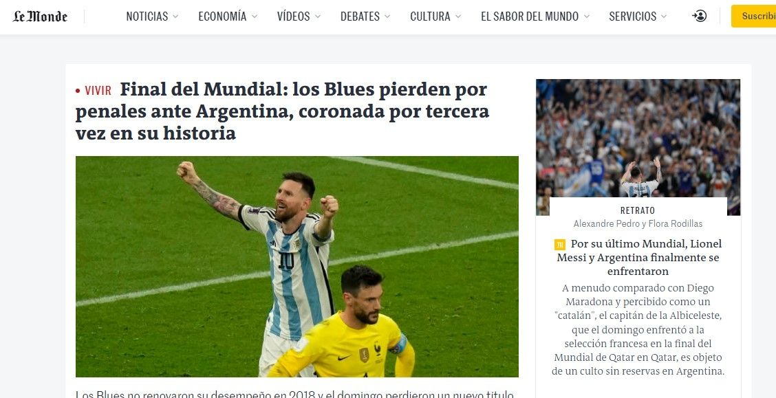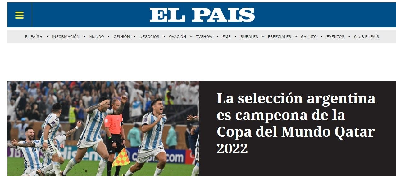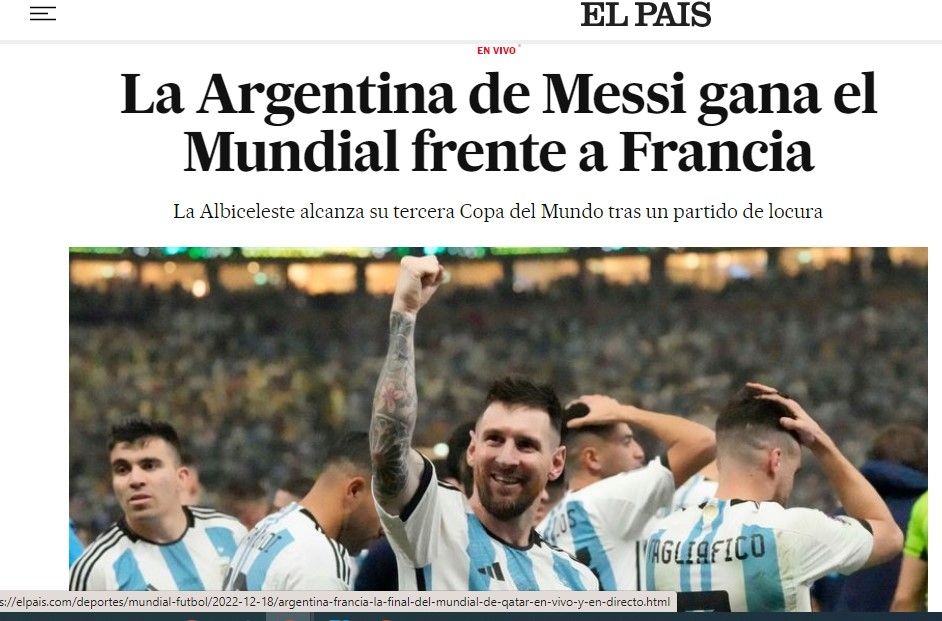 En tanto, El País de España puso como noticia principal la noticia bajo la siguiente frase: "Argentina ha derrotado este domingo a Francia en los penaltis en la final del Mundial de Qatar y ha vuelto a ganar la Copa del Mundo 36 años después en un partido de infarto".