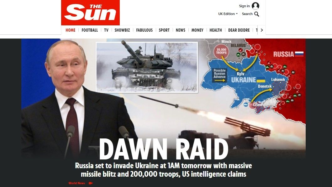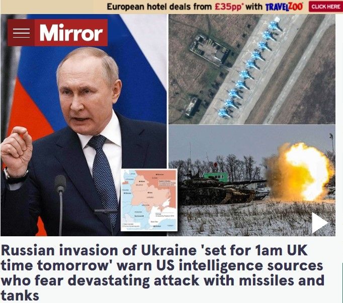 Según The Sun, "la inteligencia estadounidense dijo que la hora más probable para la orden de Putin será a las 3 a.m. Los espías estadounidenses creen que los centros de mando y control militares y gubernamentales de Kiev todavía tienen un aluvión de ataques aéreos antes de que los tanques crucen la frontera".
