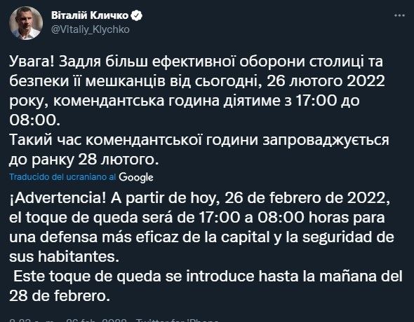 "El toque de queda en Kiev comenzará el sábado a las 17 hasta el lunes a las 8", declaró la alcaldía en un comunicado, en el que agrega que todas las personas que se encuentren en la calle durante ese periodo "serán consideradas como miembros de grupos saboteadores enemigos".