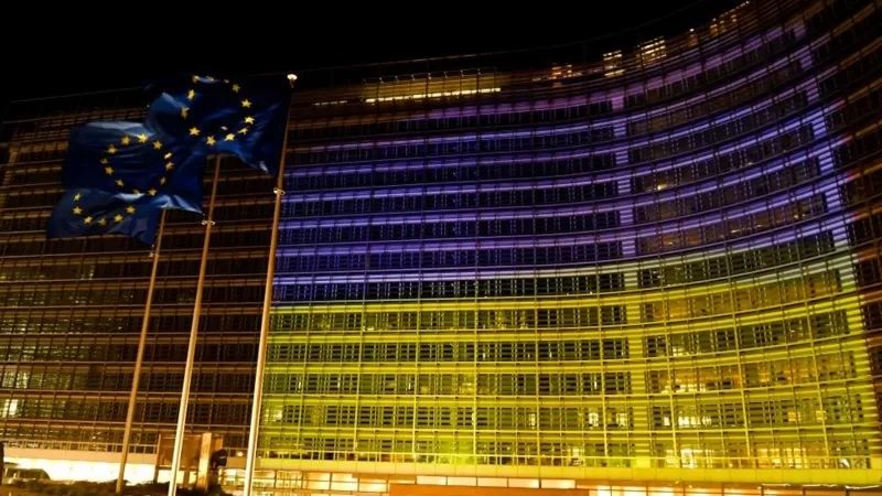 Los colores de la bandera ucraniana proyectados en el edificio Berlaymont en Bruselas.