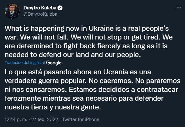 "Esto para nosotros ya es una victoria", dijo Kuleba, quien recalcó que las negociaciones en ningún caso significan que las fuerzas armadas ucranianas dejarán de combatir a las tropas rusas que entraron en su territorio. Kuleba subrayó que las negociaciones no se celebrarán en Bielorrusia, sino en la frontera con ese país, al que Kiev ha acusado de ser cómplice de la agresión de Rusia por permitir a las tropas rusas atacar a Ucrania desde su territorio.