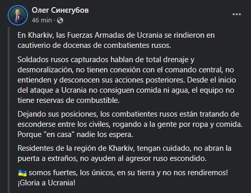 El gobernador Oleh Synyehubov dijo por Telegram que la ciudad estaba "siendo limpiada completamente del enemigo" horas después de que tropas rusas ingresaran en ella.