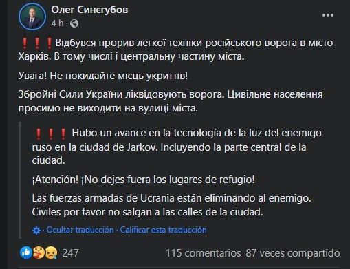 El responsable de la administración regional, Oleg Sinegubov, informó en Facebook que se registró una "incursión de vehículos ligeros del enemigo ruso en la ciudad de Jarkov, incluida la parte central".