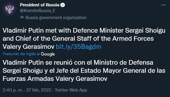 El presidente ordenó entonces a su ministro de Defensa y al jefe del estado mayor conjunto de las Fuerzas Armadas rusas poner a las fuerzas de disuasión nuclear en "alerta especial de combate", publicó la agencia de noticias AFP.