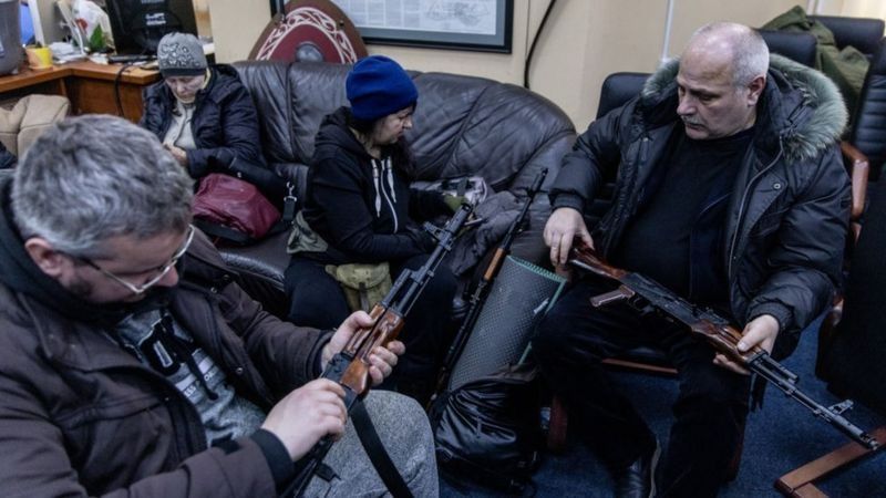Muchos civiles ucranianos han recibido armas de fuego para defenderse en caso necesario y se organizan en los barrios para fabricar cócteles molotov con los que recibir a las tropas rusas.