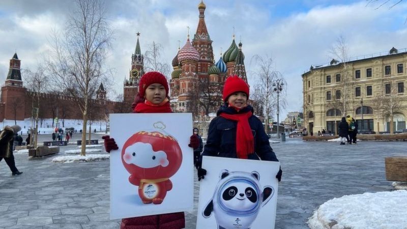 Niños en Moscú con las mascotas olímpicas de Pekín.