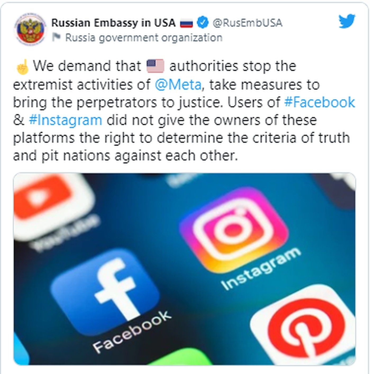 "Exigimos que las autoridades de EE.UU. detengan las actividades extremistas de Meta, tomen medidas para llevar ante la justicia a los perpetradores", escribió en un mensaje en Twitter la embajada de Rusia en EE.UU.