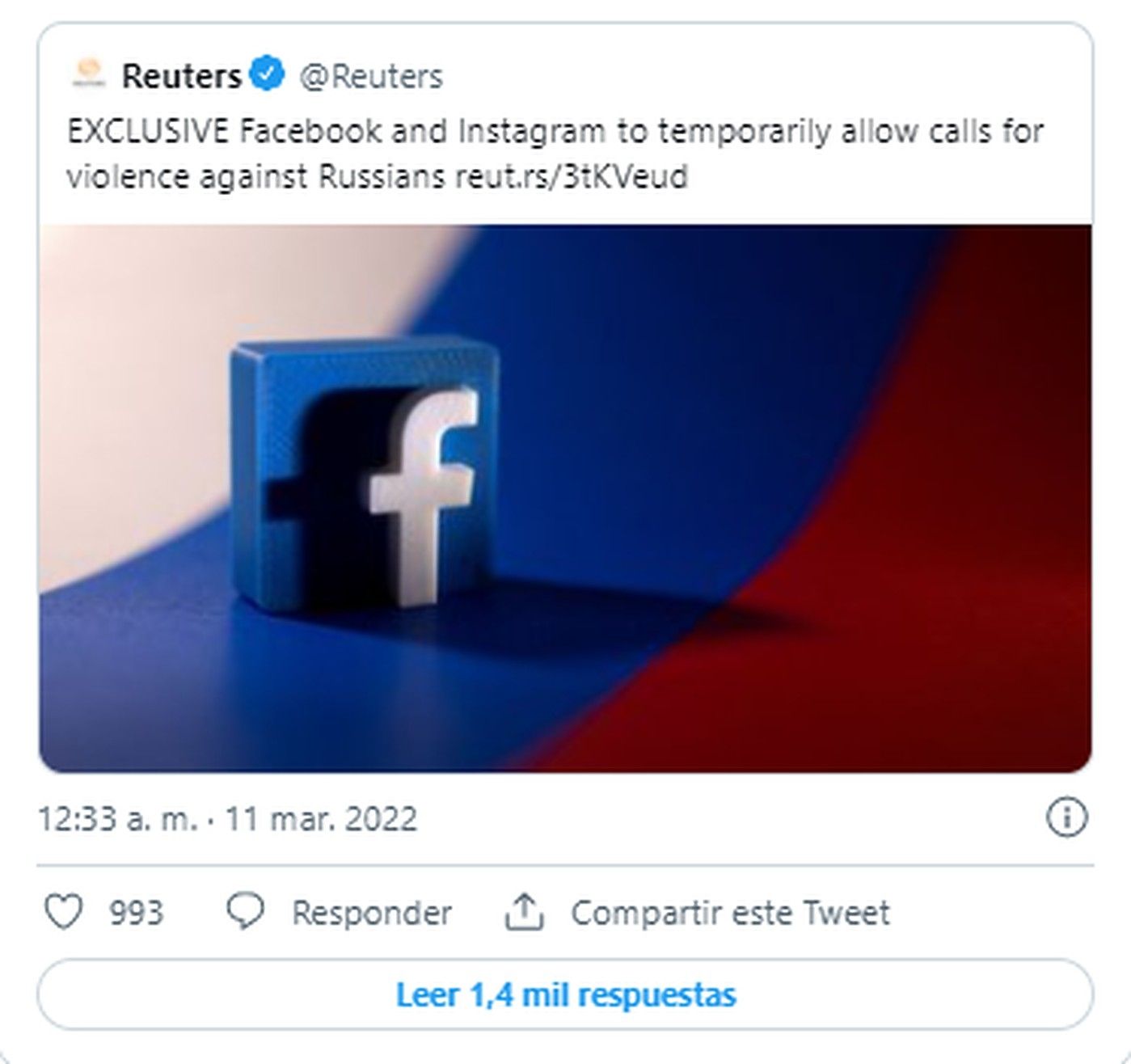 Previamente, Meta, la empresa propietaria de Facebook e Instagram, anunció que permitirá a sus usuarios de algunos países llamar a la violencia contra Vladimir Putin y los soldados rusos.