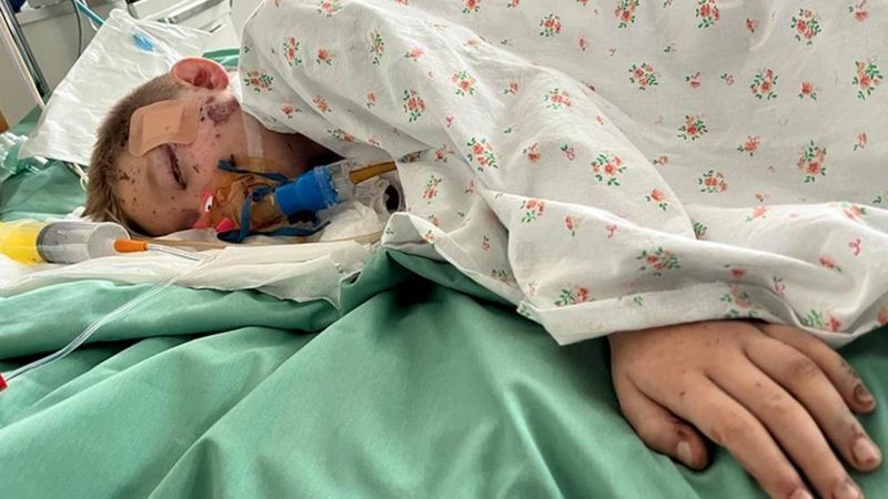 En una cama cercana está Dmitry, de ocho años. Los dedos de sus pies sobresalen por debajo de la manta y una mano, magullada y ensangrentada, también se asoma. Su cara está raspada y llena de cicatrices con cientos de marcas. Su ojo derecho no está del todo cerrado. Hace unos días, los médicos le sacaron una bala debajo del cráneo y las vértebras.