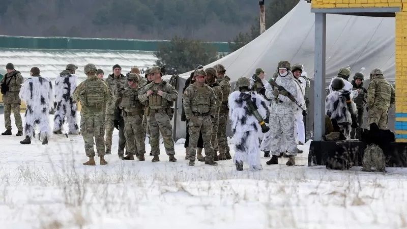 Fotos de principios de febrero muestran a instructores del ejército de EE.UU. participando en simulacros en la base con miembros del servicio ucraniano.