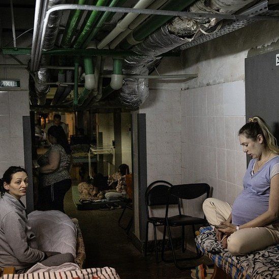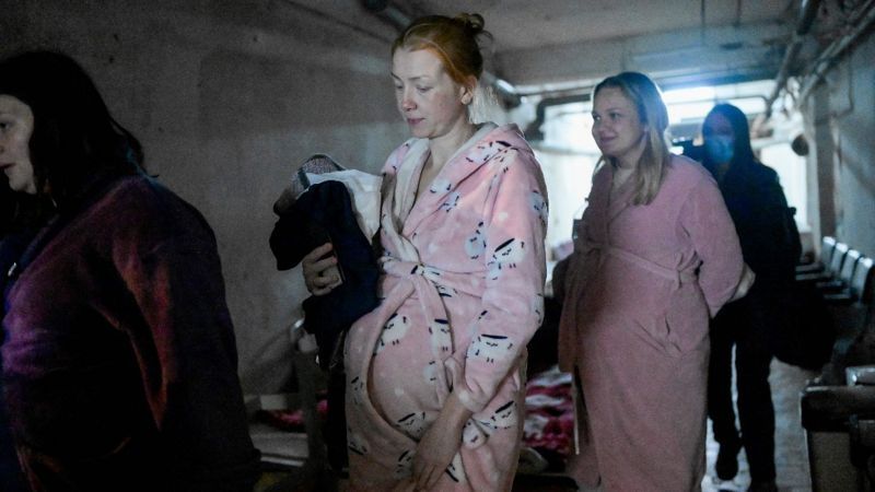 Embarazadas bajando a un refugio subterráneo en la ciudad de Mykolaiv. Cerca de 80.000 mujeres en Ucrania darán a luz en los próximos tres meses, según la ONU.
