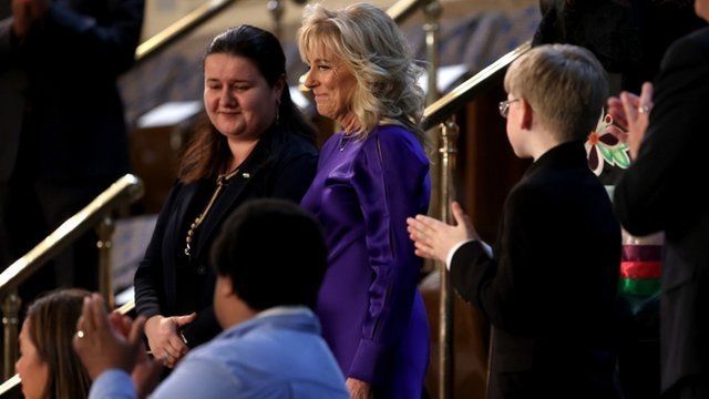 Los legisladores demócratas y republicanos ovacionaron de pie al pueblo ucraniano cuando Biden les pidió esa "señal" y mencionó que la embajadora de ese país en EE.UU., Oksana Markarova, estaba presente en la sala junto a la primera dama, Jill Biden.