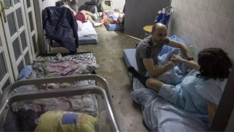 Fotografías mosraron a las mujeres embarazadas y sus parejas, y algunos de los recién nacidos refugiándose en el sótano del hospital de Kiev.