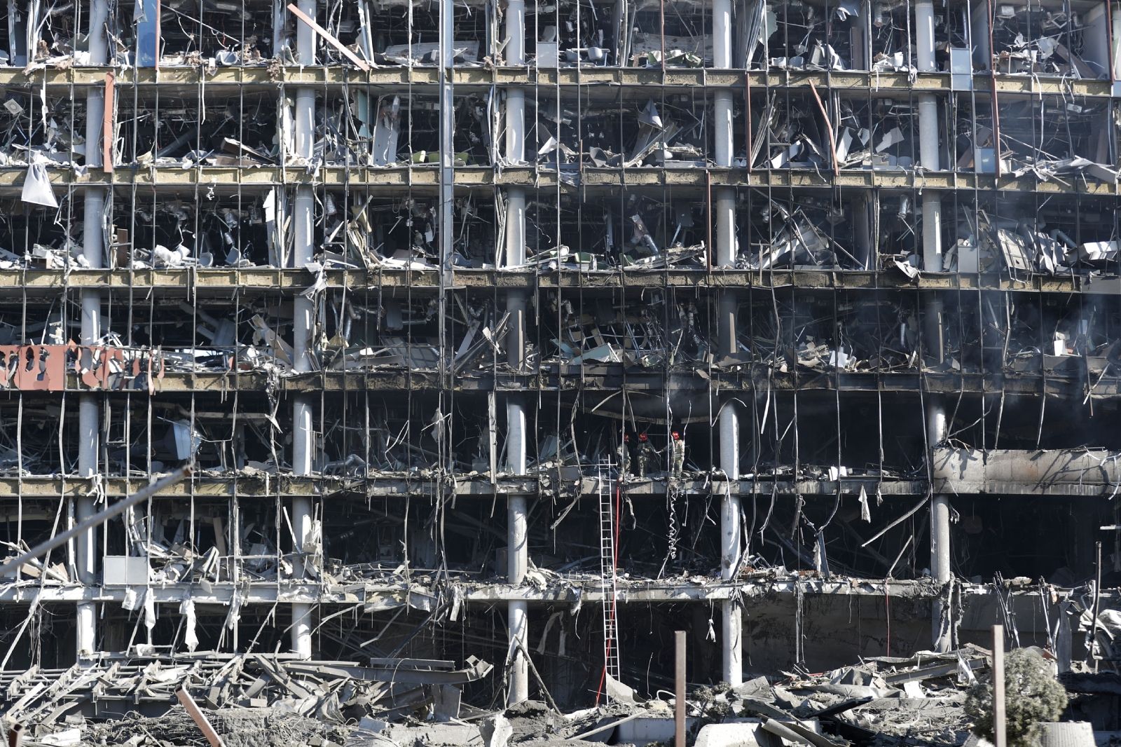 Entre los escombros, un grupo de bomberos y militares buscan a más víctimas, al pie de un edificio de diez plantas carbonizado y aún humeante del que sólo queda la estructura de hormigón. “Son las oficinas del centro comercial, afortunadamente, no había nadie”, explica un vecino.