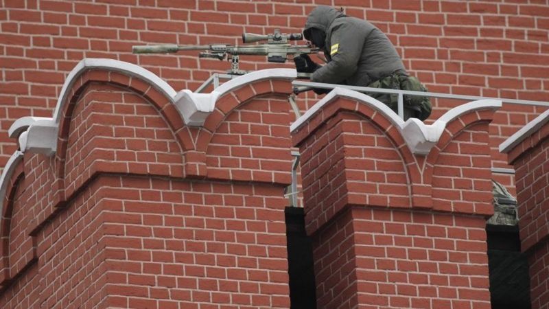 Un francotirador del FSO ubicado en una de las paredes del Kremlin, en el centro de Moscú.