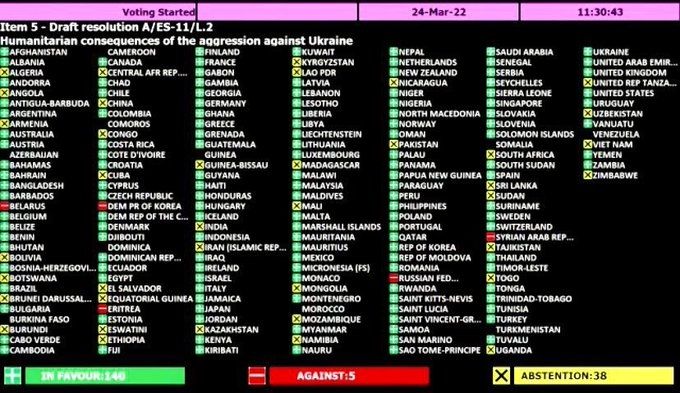 Durante la jornada en la que se cumple un mes del día en que el gobierno de Vladimir Putin invadió territorio ucraniano, la Organización volvió a tratar el tema del conflicto bélico que ya a dejado decenas de muertos y heridos. De los 193 miembros que constituyen el plenario, 140 apoyaron la iniciativa, mientras que solo cinco de ellos la rechazaron. Rusia, Siria, Eritrea, Bielorrusia y Corea del Norte fueron quienes dieron la negativa y 38 se abstuvieron.