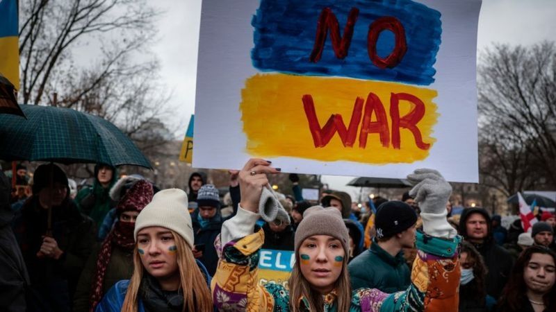 Una manifestante en Washington, EE.UU., sostiene un cartel que dice "No guerra" con los colores de la bandera ucraniana.