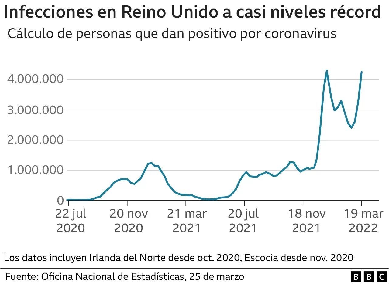 En una semana los casos de covid en Reino Unido aumentaron en un millón, según revelan los datos de la Oficina Nacional de Estadísticas británica.