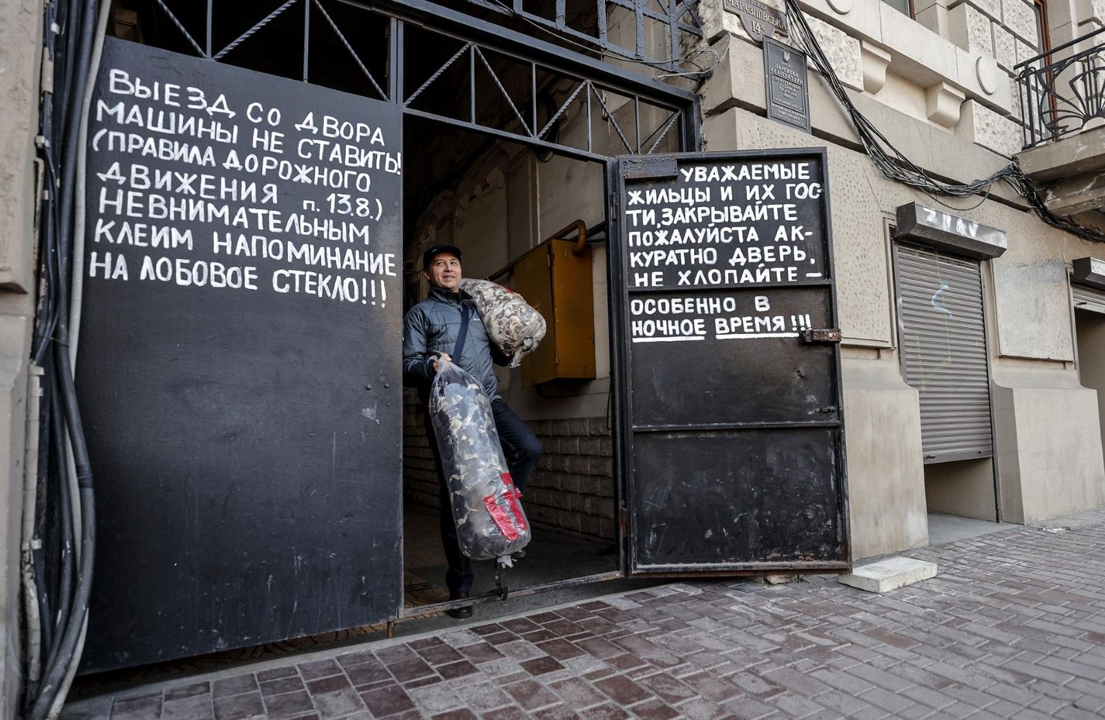 Las puertas barrocas del edificio redondo se ven ahora cubiertas por sacos blancos amontonados y nadie puede acceder a sus aledaños. El silencio es total, solo roto por el maullido de una gata que se acerca pidiendo cariño. Vlad, de voz suave, mira su fachada principal, respira y entorna los ojos con la pregunta.