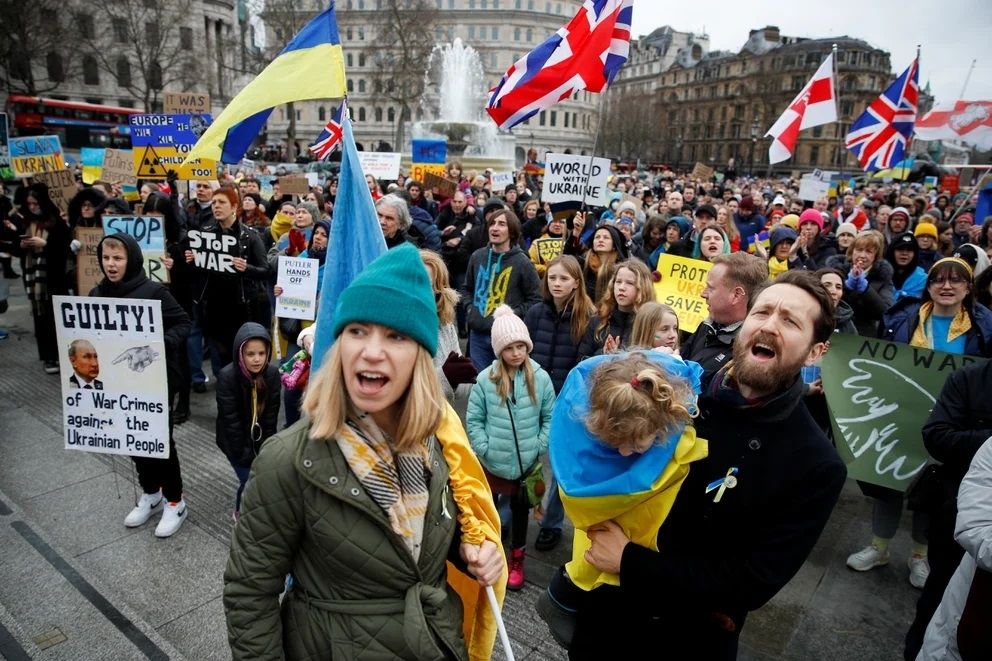 Trafalgar Square, en Londres, fue el centro de reunión de miles de ingleses que protestaron contra la invasión, mientras que, en París, la diseñadora ucraniana Lili Litkovskaya, se instaló en el salón de moda Tranoi con una bandera azul y amarilla para reclamar que otros diseñadores se movilicen en redes sociales.