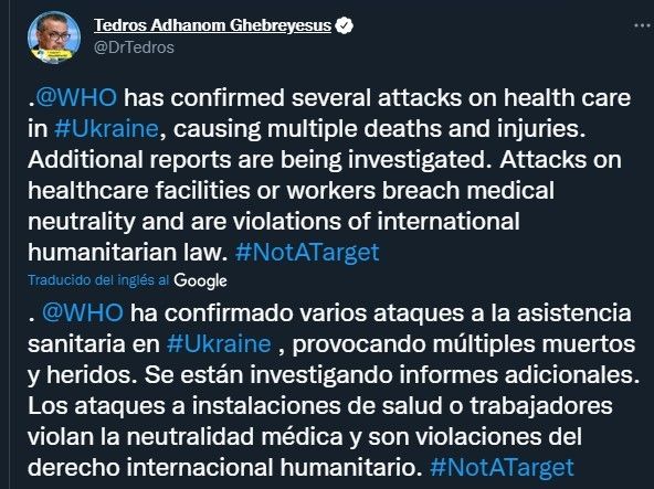 "Los ataques a instalaciones de salud o trabajadores violan la neutralidad médica y son violaciones del derecho internacional humanitario", dijo Tedros en el comunicado, informó la agencia de noticias DPA.