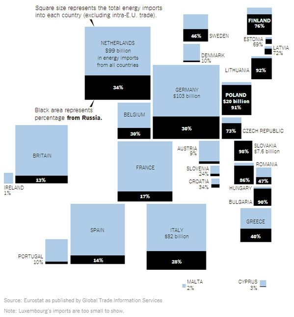 En la imagen anterior se puede ver la cantidad de energía que importan los países de Europa, la parte negra corresponde a las importaciones desde Rusia.