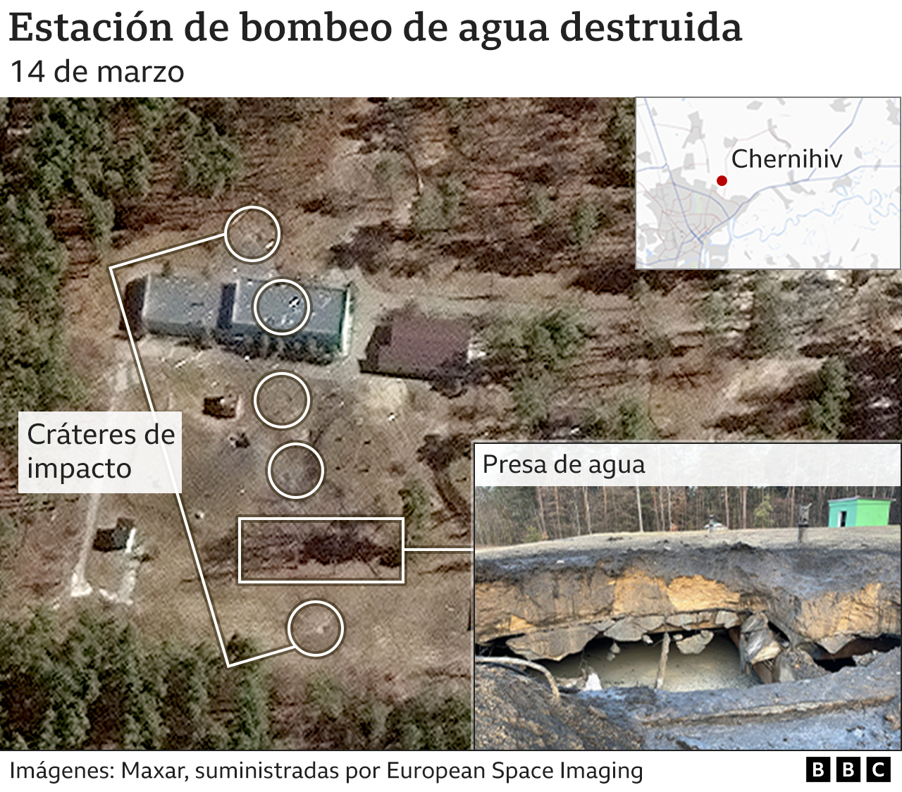 El ataque averió severamente una presa de agua y destruyó una sala de control, según el director de la empresa de acueducto de Chernihiv, Serhiy Malyavko, que añadió que un trabajador de la planta -y tres miembros de su familia- murieron. La familia había tomado refugio allí después de que su casa fuera destruida por artillería.